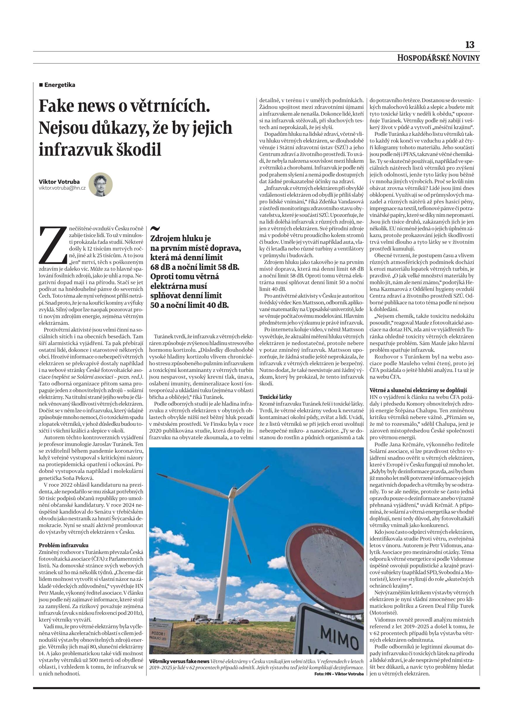 „Nejsem chemik, takže toxicitu nedokážu posoudit,“ reagoval Maule z fotovoltaické asociace na dotaz HN, zda ani ve vyjádřeních Turánka ohledně toxicity větrných elektráren nespatřuje problém. Sám Maule jako hlavní problém spatřuje infrazvuk.