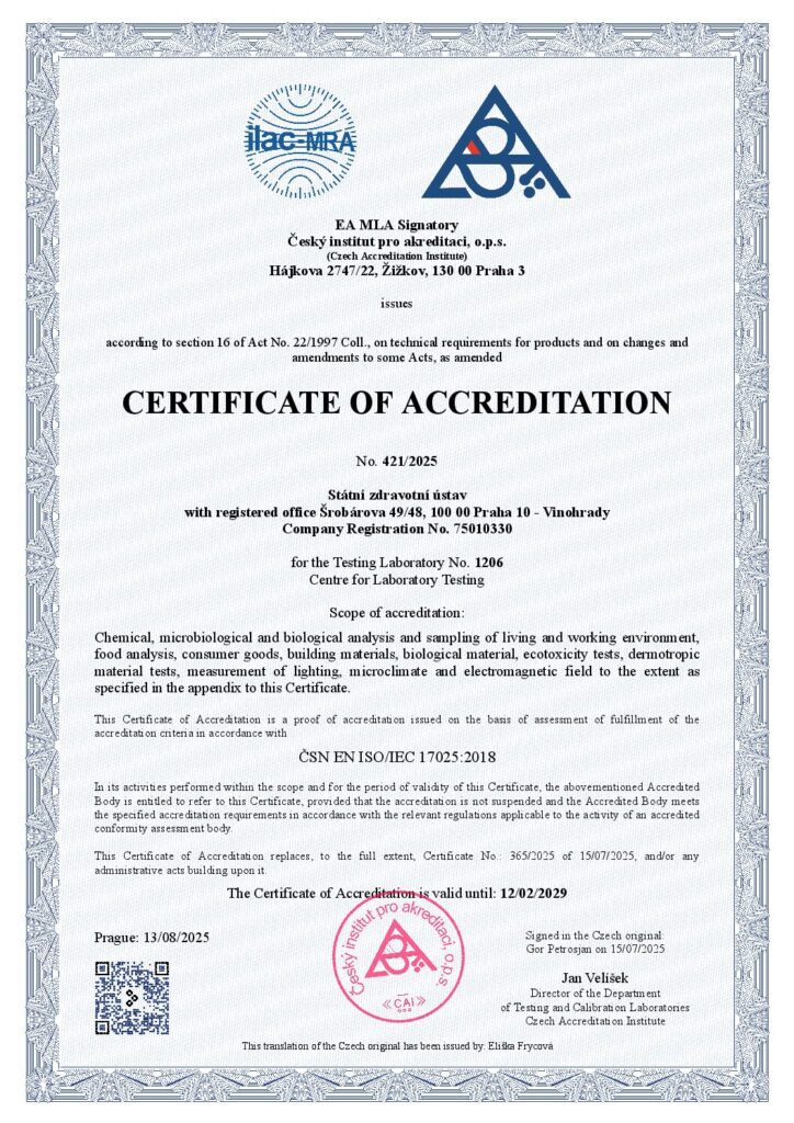 1. Centrum laboratorních činností (CLČ) Státního zdravotního ústavu (SZÚ) je akreditováno ČIA podle normy ČSN EN ISO IEC 17025 jako zkušební laboratoř č. 1206.