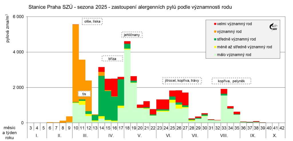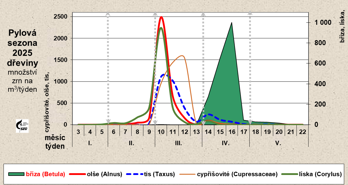 - jarní 5. – 13. týden (únor – březen, duben) – olše, líska, bříza, cypřišovité