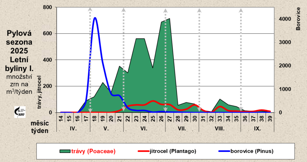 Nejvýznamnějším alergenem v pozdně jarním období je pyl trav lipnicovitých (Poaceae). V roce 2025 začaly trávy kvést na konci dubna a jejich pyl se nacházel v ovzduší do konce září. Nejvyšší hodnoty byly v období od konce května do půlky července s kulminací ve 27. týdnu (714 zrn).