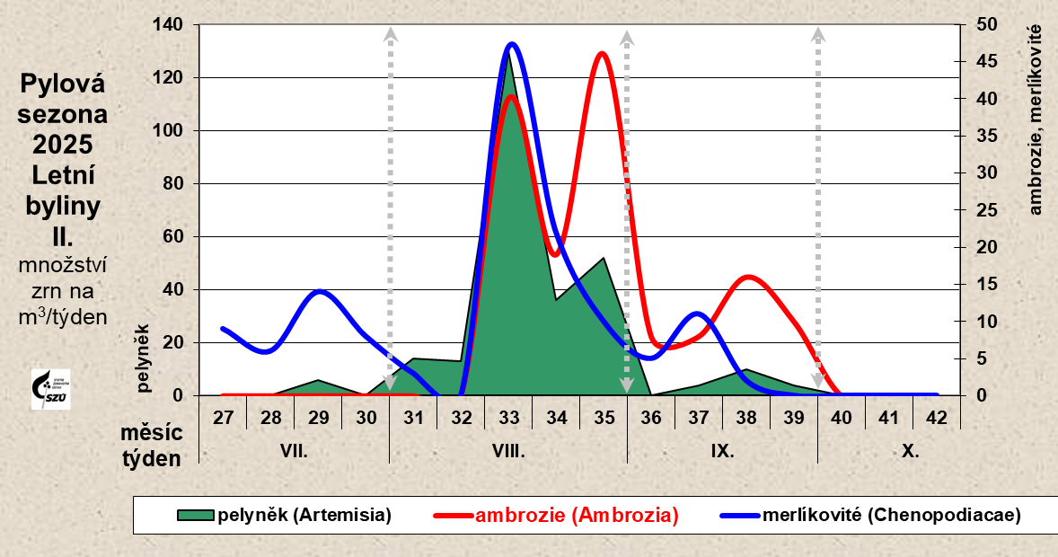 - letní 26. – 38. týden (červenec – září) – jitrocel, pelyněk, ambrozie