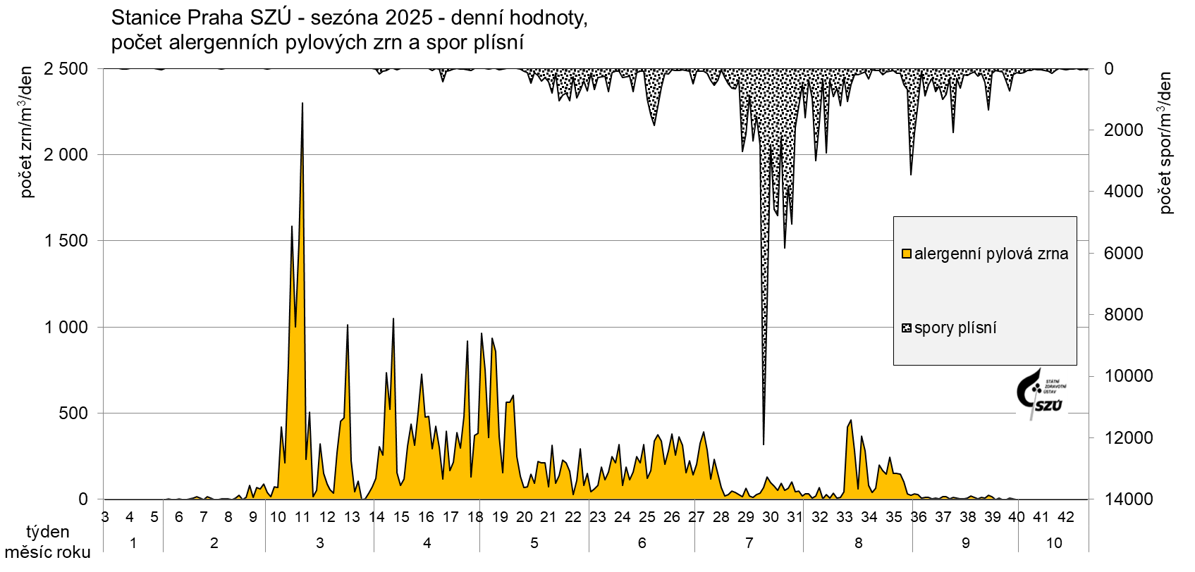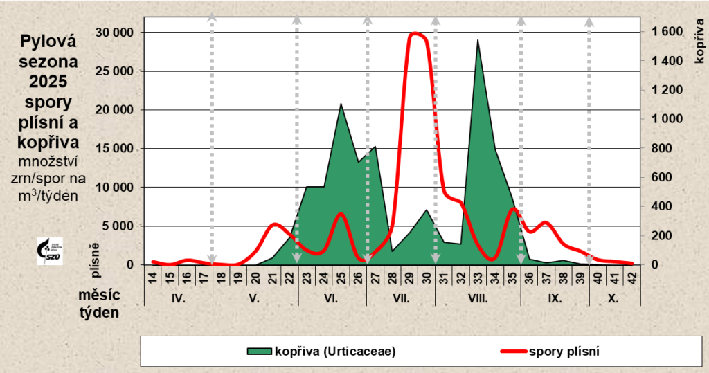 - raně podzimní 39. týden a dále (konec září až říjen) – ambrozie, pelyněk a spory plísní, které jsou v ovzduší zastoupeny po celé sledované období